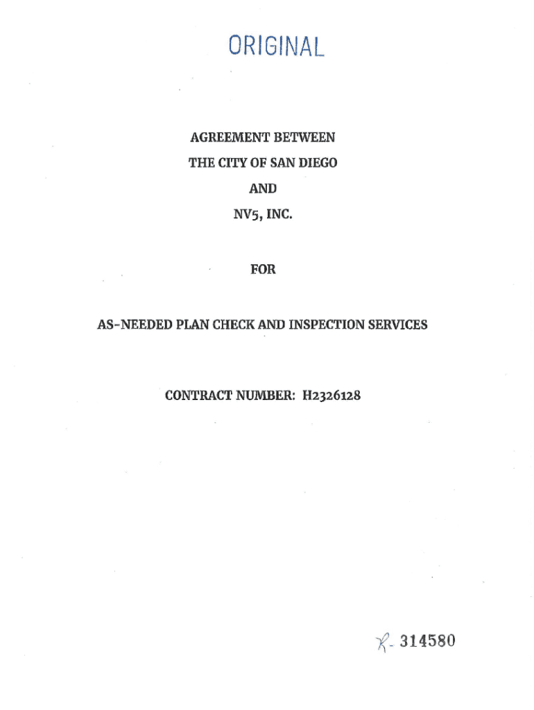 ORIGINALAGREEMENT BETWEEN THE CITY OF SAN DIEGO ANDNV5, INC.FORASNEEDED PLAN CHECK AND INSPECTION SERVICESCONTRACT NUMBER: 82326128tf 314580AGREEMENT FOR NEEDED CONSULTANT SERVICES TABLE OF CONTENTS