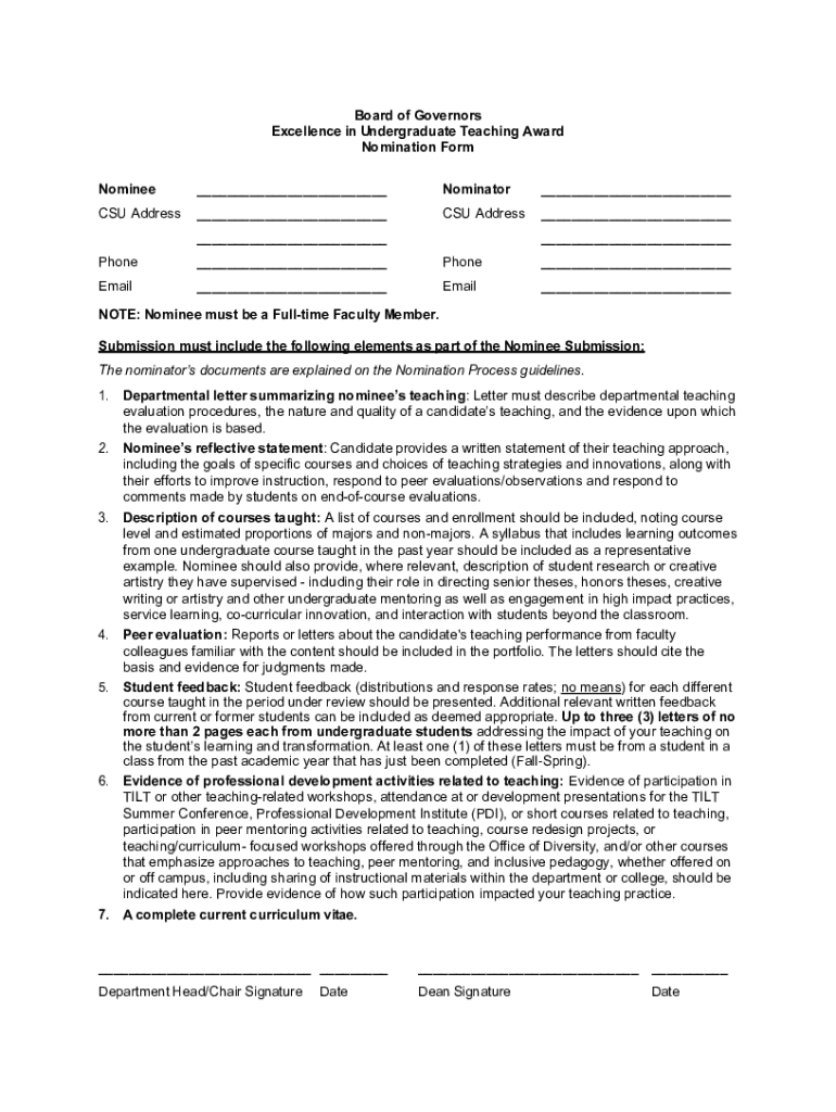 Board of Governors Excellence in Undergraduate Teaching Award Nomination Form Nominee___Nominator___CSU Address___CSU Address_________Phone___Phone___Email___Email___NOTE: Nominee must be a Full time