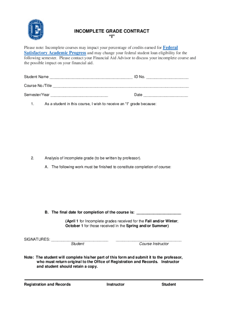 INCOMPLETE GRADE CONTRACT I Please note: Incomplete courses may impact your percentage of credits earned for Federal Satisfactory Academic Progress and may change your federal student loan eligibility