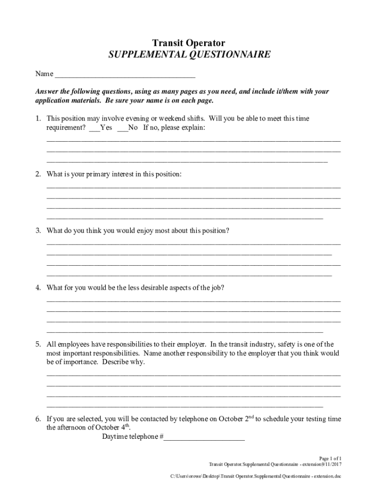 Get the free Transit Operator.Supplemental Questionnaire - extension