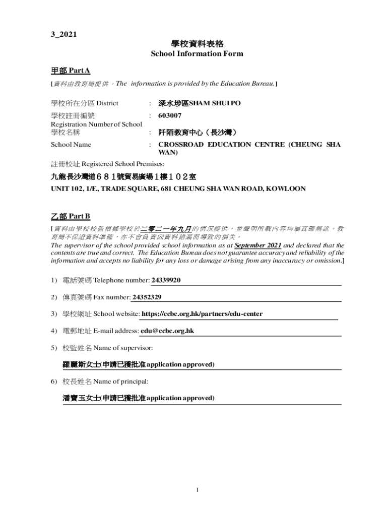 3_2021 School Information Form Part A [The information is provided by the Education Bureau.] District: SHAM SHU IPO : 603007 Registration Number of School : School Name: CROSSROAD EDUCATION Center