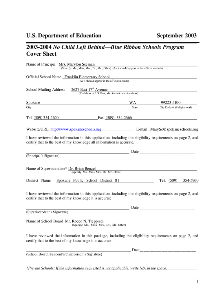 U.S. Department of Education September 200320032004 No Child Left BehindBlue Ribbon Schools Program Cover Sheet Name of Principal Mrs. Marylou Seaman (Specify: Ms., Miss, Mrs., Dr., Mr., Other) (As
