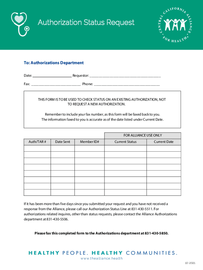 Authorization Status Request: Authorizations Department Date: ___ Requestor: ___ Fax: ___ Phone: ___THIS FORM IS TO BE USED TO CHECK STATUS ON AN EXISTING AUTHORIZATION, NOT TO REQUEST A NEW AUTHORIZATION.