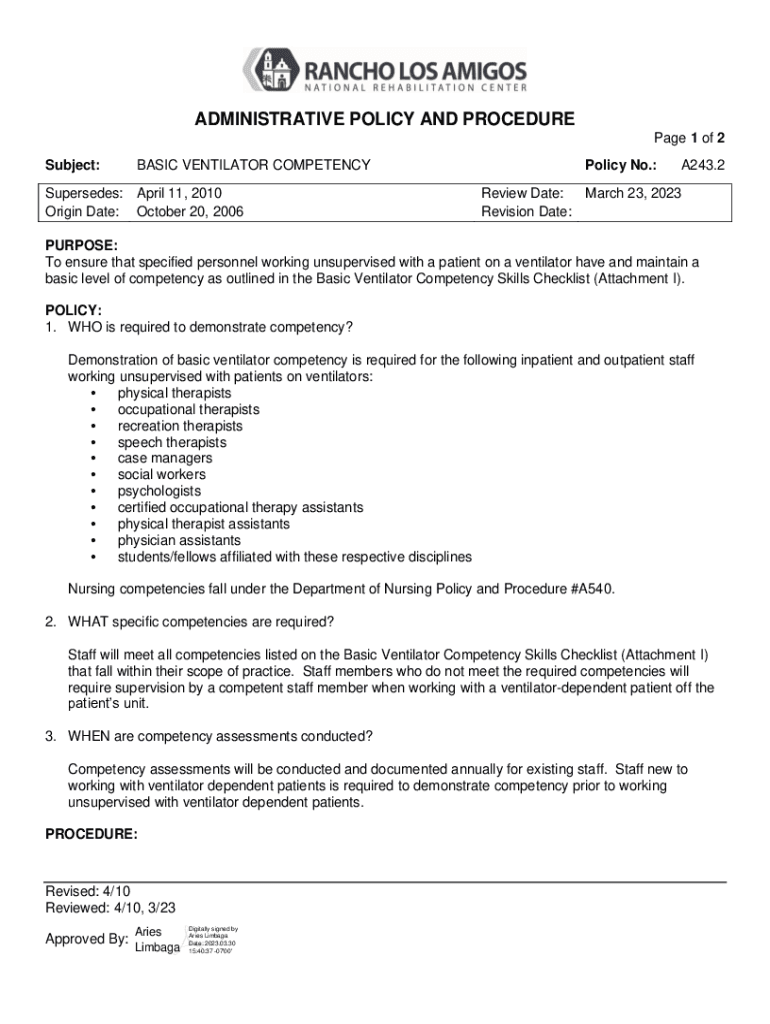 ADMINISTRATIVE POLICY AND PROCEDURE Page 1 of 2 Subject:BASIC VENTILATOR COMPETENCYSupersedes: April 11, 2010, Origin Date: October 20, 2006Policy No.: Review Date: Revision Date:A243.2March 23, 2023PURPOSE: