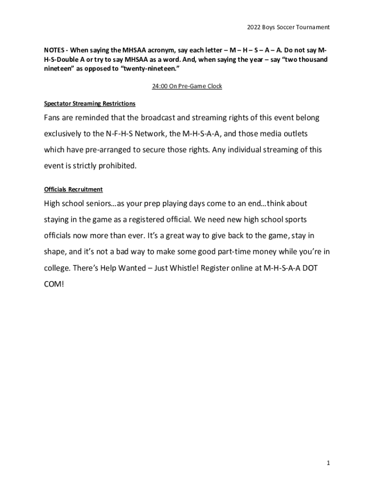 2022 Boys Soccer TournamentNOTES When saying the MH SAA acronym, say each letter M H S A. Do not say Double A or try to say MH SAA as a word. And, when saying the year say two thousand nineteen as