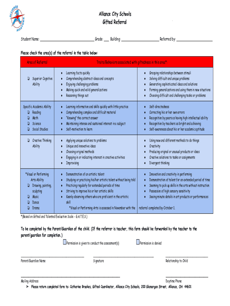 Alliance City Schools Referral for Gifted Academic Screening and Permission for Assessment Gifted Referral Student Name: ___ Grade: ___ Building: ___ Referred by: ___ Please check the area(s) of the