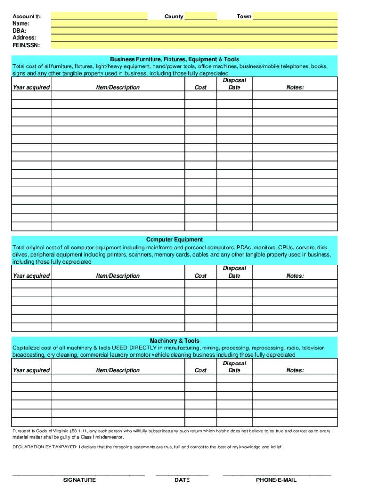 Account #: Name: DBA: Address: VEIN/SSN:CountyTownBusiness Furniture, Fixtures, Equipment & Tools Total cost of all furniture, fixtures, light/heavy equipment, hand/power tools, office machines, business/mobile