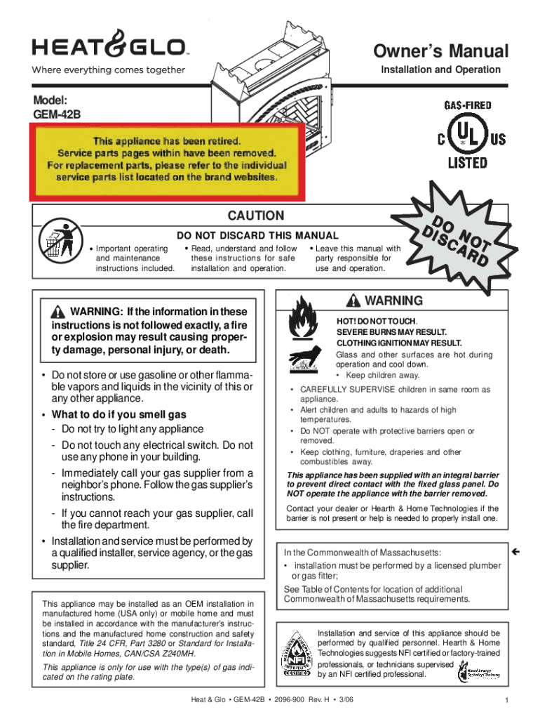 Owners Manual Installation and OperationModel: GEM42BCAUTION DO NOT DISCARD THIS MANUAL Important operating and maintenance instructions included. Read, understand and follow these instructions for