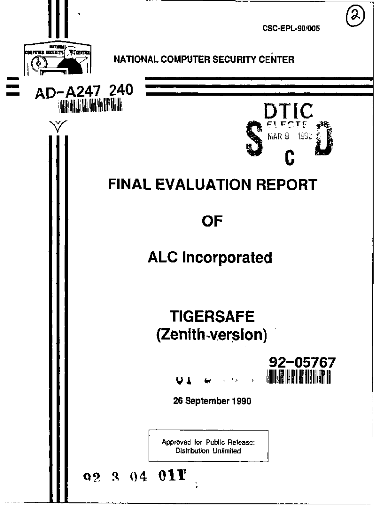 IIICSCEPL90/005NATIONAL COMPUTER SECURITY CENTERADA247 240il/IL/ll ill/l/LGIL/LD T ICC FINAL EVALUATION REPORT ALC Incorporated TIGERS AFE(Zenith version) 9205767 26 September 1990Approved for Public