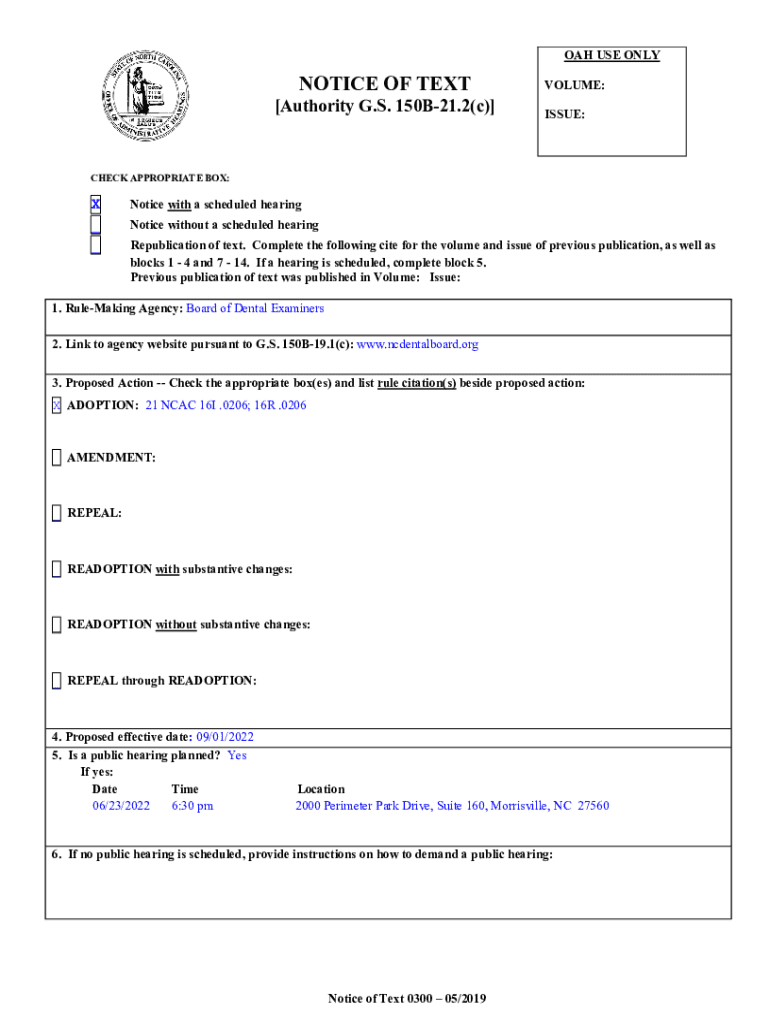 Get the free NOTICE OF TEXT - Authority GS 150B-21.2(c)