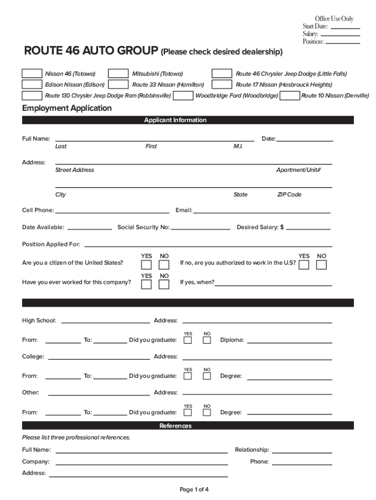 Office Use Only Start Date: Salary: Position:ROUTE 46 AUTO GROUP (Please check desired dealership) Nissan 46 (Toyota)Mitsubishi (Toyota)Route 46 Chrysler Jeep Dodge (Little Falls)Edison Nissan (Edison)Route