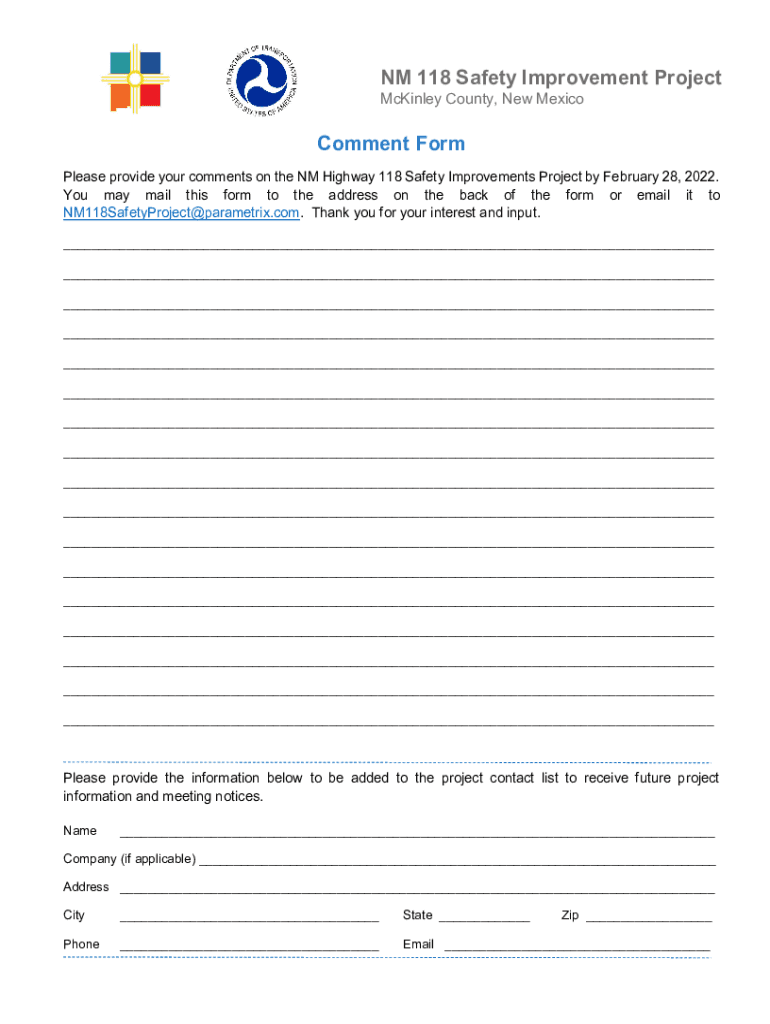 Get the free NM 118 Safety Improvement Project Comment Form - nmdot