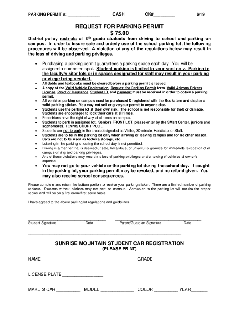 SPARKING PERMIT #: ___CK#___6/19REQUEST FOR PARKING PERMIT $75.00 District policy restricts all 9th grade students from driving to school and parking on campus. In order to insure safe and orderly