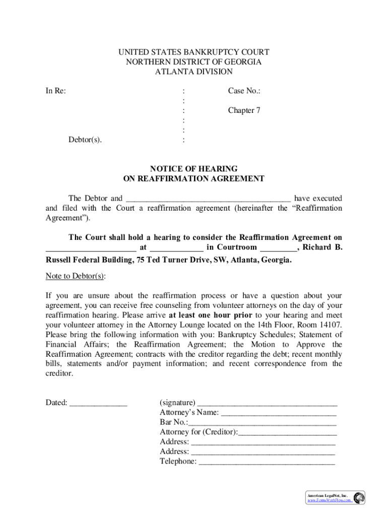Get the free Notice Of Hearing On Reaffirmation Agreement :: Georgia : ...