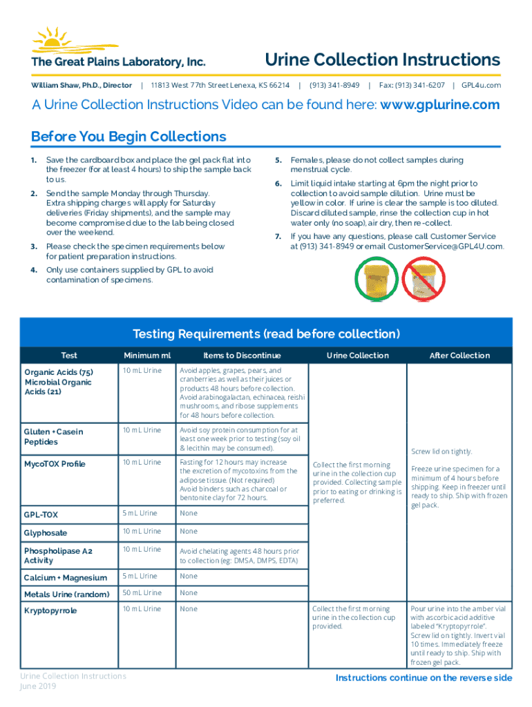 Urine Collection Instructions William Shaw, Ph.D., Director| 11813 West 77th Street Lenexa, KS 66214|(913) 3418949|Fax: (913) 3416207 | GPL4u. Coma Urine Collection Instructions Video can be found