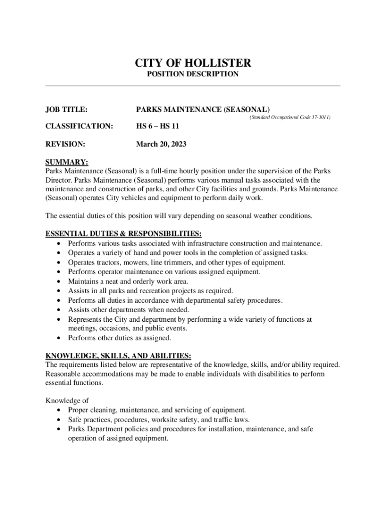 CITY OF HOLLISTER POSITION DESCRIPTION ___JOB TITLE:PARKS MAINTENANCE (SEASONAL) (Standard Occupational Code 373011)CLASSIFICATION:HS 6 HS 11REVISION:March 20, 2023SUMMARY: Parks Maintenance (Seasonal)