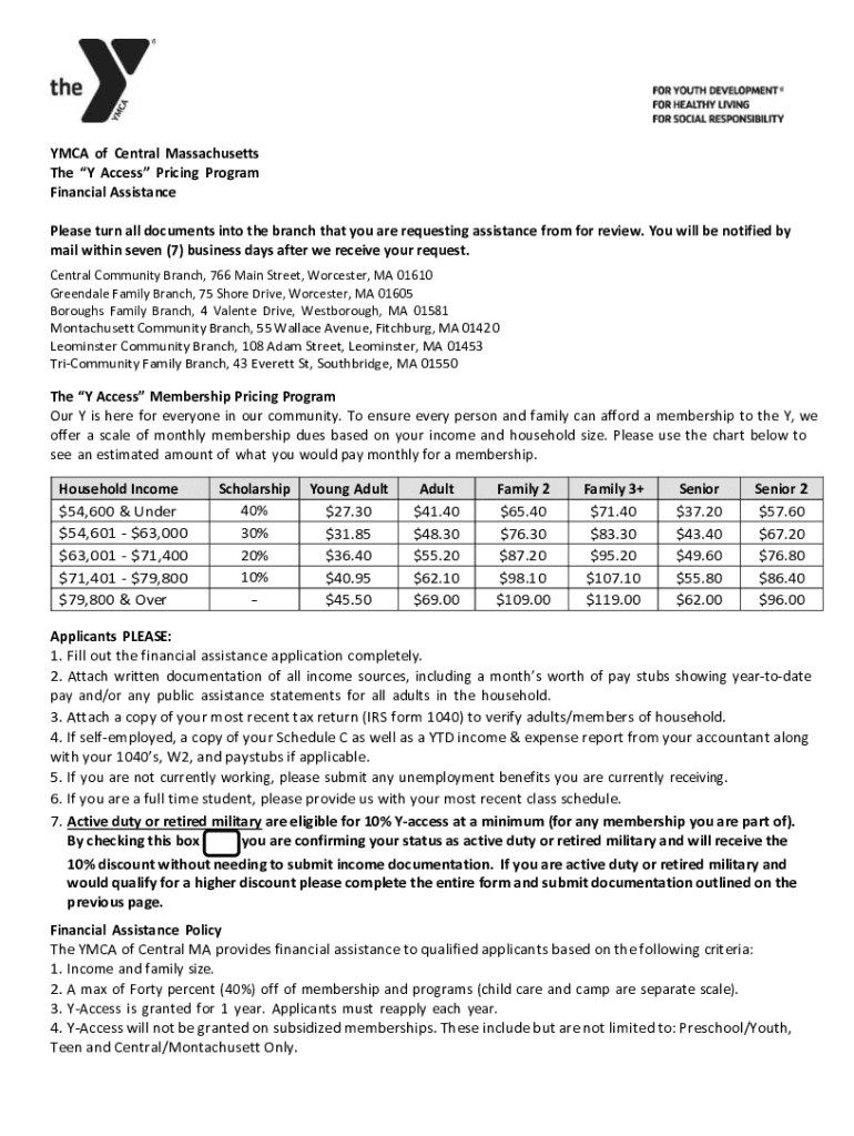 YMCA of Central Massachusetts The Y Access Pricing Program Financial Assistance Please turn all documents into the branch that you are requesting assistance from for review. You will be notified by