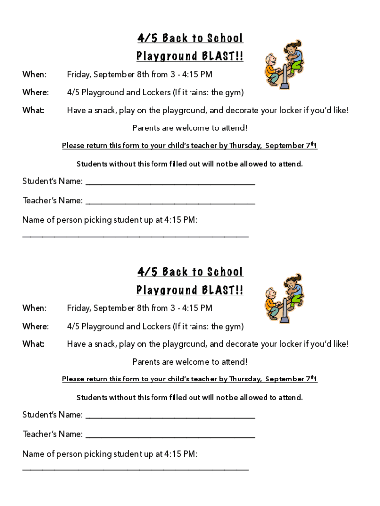 4/5 B a c k t o S c h o o l Play RO u ND BLAST! ! When:Friday, September 8th from 3 4:15 Where:4/5 Playground and Lockers (If it rains: the gym)What:Have a snack, play on the playground, and decorate