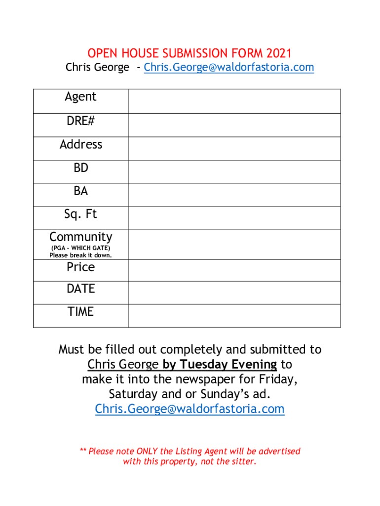 OPEN HOUSE SUBMISSION FORM 2021Chris George Chris.George@waldorfastoria.comAgent ARE# Address BD BA Sq. Ft Community (PGA WHICH GATE) Please break it down. Price DATE TIME Must be filled out completely