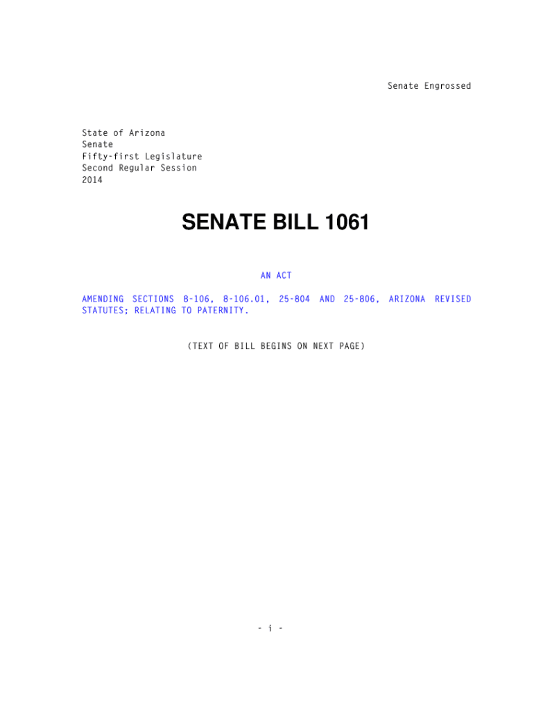 Senate EngrossedState of Arizona Senate Fifty first Legislature Second Regular Session 2014SENATE BILL 1061 AN ACT AMENDING SECTIONS 8106, 8106.01, STATUTES; RELATING TO PATERNITY.25804AND25806,(TEXT