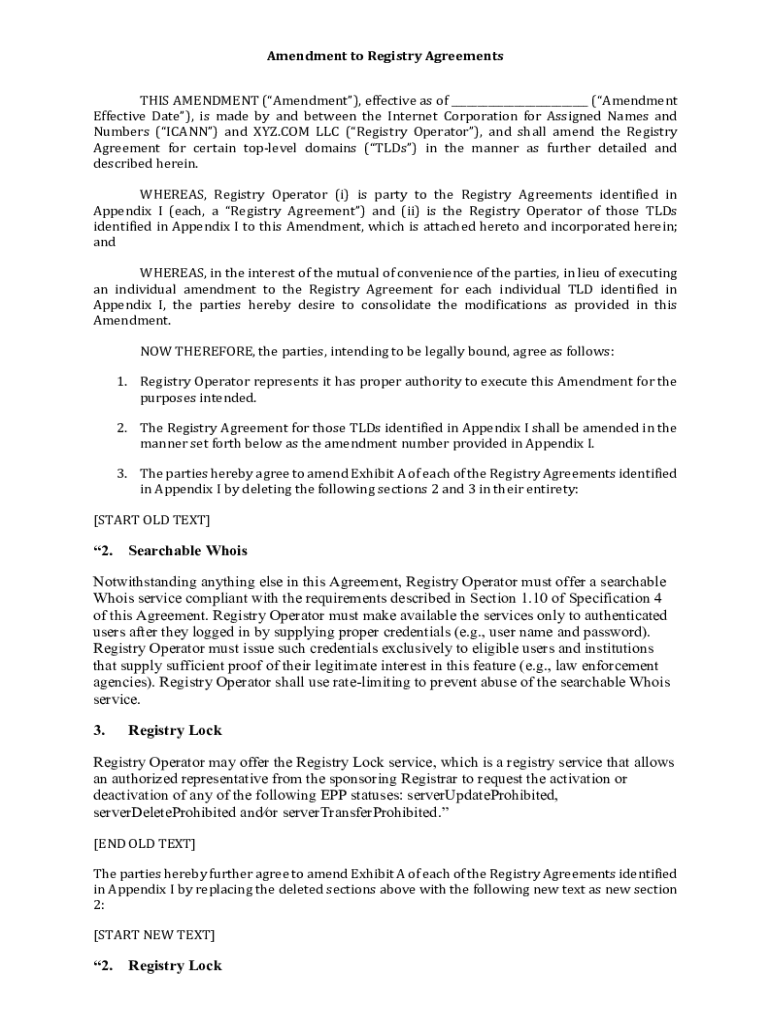 Amendment to Registry AgreementsTHIS AMENDMENT (Amendment), effective as of ___ (AmendmentEffectiveDate), ismadebyandbetweentheInternetCorporationforAssignedNamesandNumbers(ICANN)and XYZ.COM LLC(RegistryOperator),