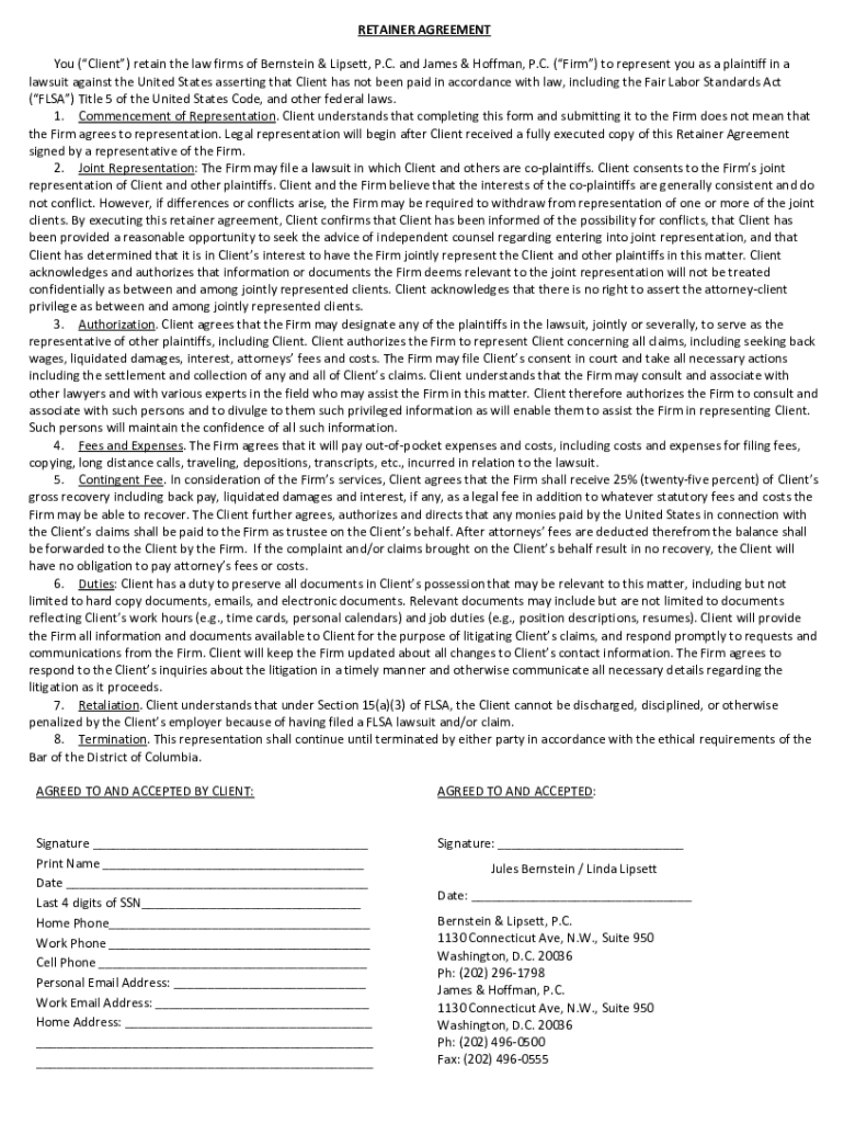 RETAINER AGREEMENT You (Client) retain the law firms of Bernstein & Lip sett, P.C. and James & Hoffman, P.C. (Firm) to represent you as a plaintiff in a lawsuit against the United States asserting