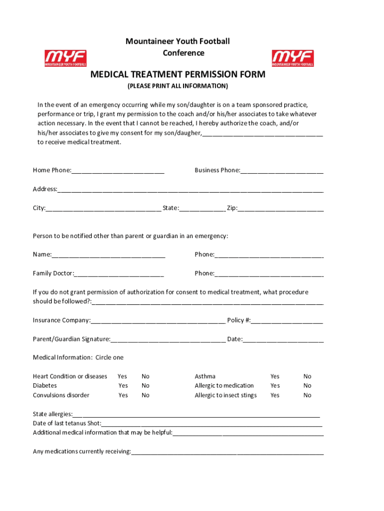 Mountaineer Youth Football ConferenceMEDICAL TREATMENT PERMISSION FORM (PLEASE PRINT ALL INFORMATION) In the event of an emergency occurring while my son/daughter is on a team sponsored practice,