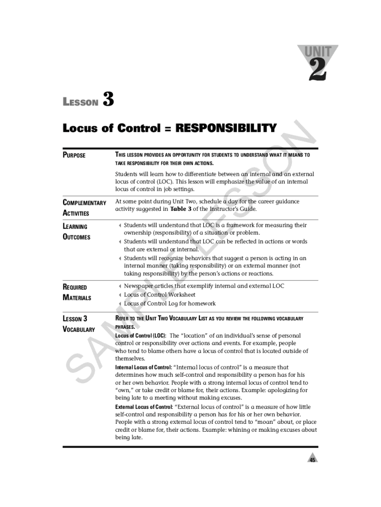 LESSON3NLocus of Control RESPONSIBILITY THIS LESSON PROVIDES AN OPPORTUNITY FOR STUDENTS TO UNDERSTAND WHAT IT MEANS TO TAKE RESPONSIBILITY FOR THEIR OWN ACTIONS.OPURPOSECOMPLEMENTARY ACTIVITIESSSStudents
