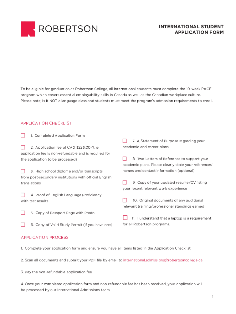 INTERNATIONAL STUDENT APPLICATION Form be eligible for graduation at Robertson College, all international students must complete the 10week PACE program which covers essential employability skills