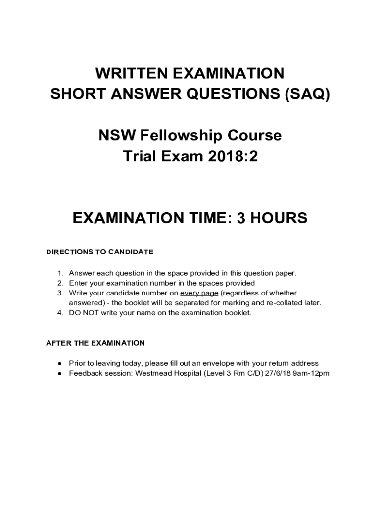 WRITTEN EXAMINATION SHORT ANSWER QUESTIONS (SAQ) NSW Fellowship Course Trial Exam 2018:2EXAMINATION TIME: 3 HOURS DIRECTIONS TO CANDIDATE 1. Answer each question in the space provided in this question