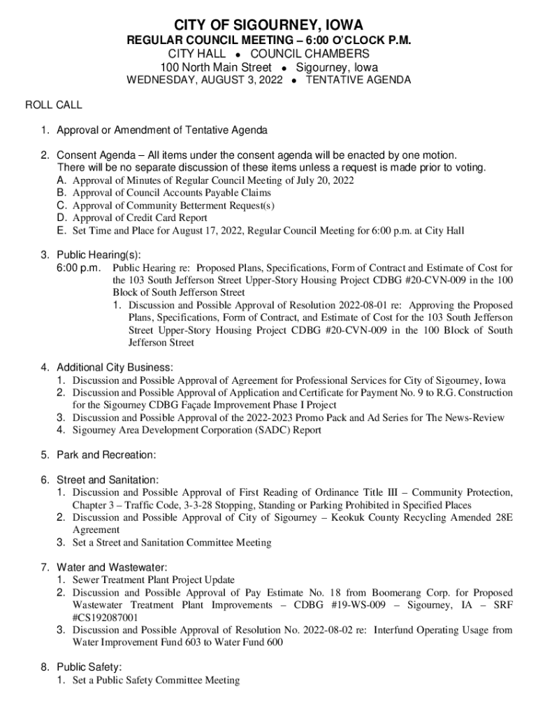 CITY OF SIGOURNEY, IOWA REGULAR COUNCIL MEETING 6:00 O'CLOCK. CITY HALL COUNCIL CHAMBERS 100 North Main Street Sigourney, Iowa WEDNESDAY, AUGUST 3, 2022TENTATIVE AGENDAROLL CALL 1. Approval or Amendment