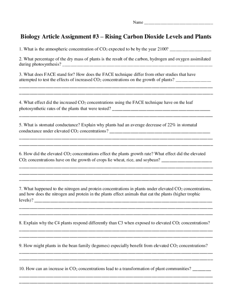 Name ___Biology Article Assignment #3 Rising Carbon Dioxide Levels and Plants 1. What is the atmospheric concentration of CO2 expected to be by the year 2100? ___ 2. What percentage of the dry mass