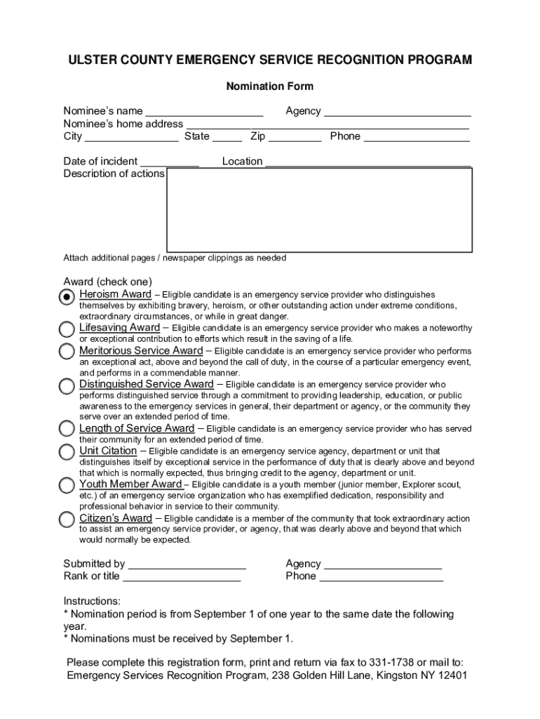 ULSTER COUNTY EMERGENCY SERVICE RECOGNITION PROGRAM Nomination Form Nominees name ___ Agency ___ Nominees home address ___ City ___ State ___ Zip ___ Phone ___ Date of incident ___ Location ___ Description