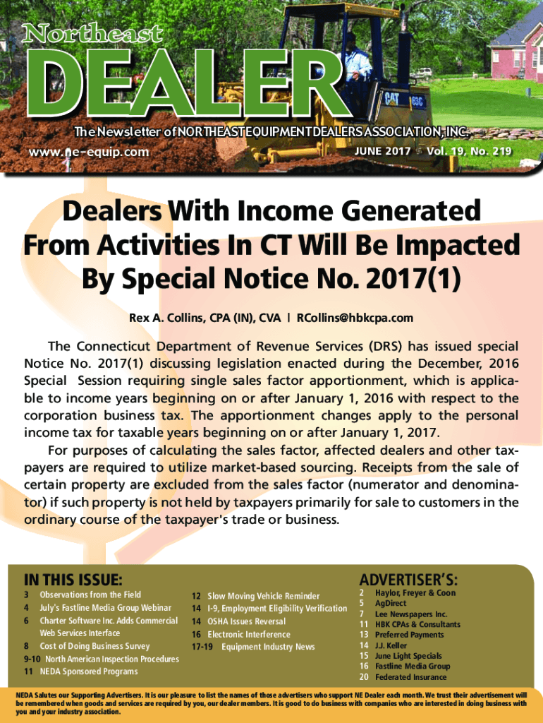 NortheastDEALERThe Newsletter of Northeast Equipment Dealers Association, Inc.www.neequip.comJUne 2017 c Vol. 19, No. 219Dealers With Income Generated From Activities In CT Will Be Impacted By Special