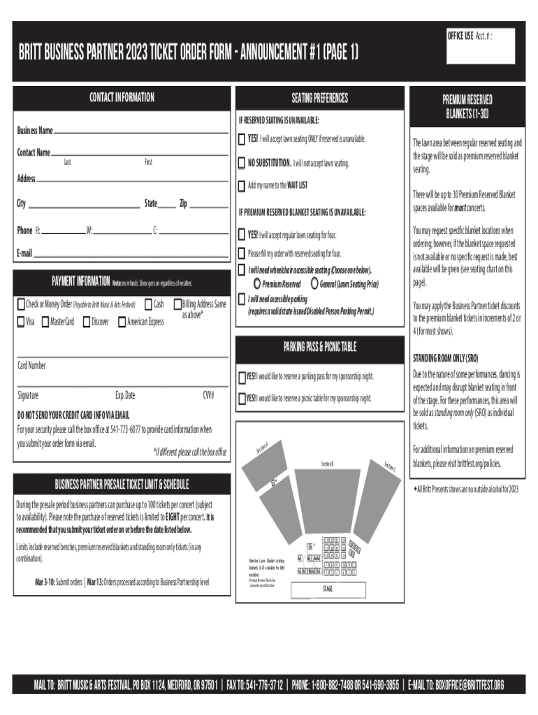 OFFICE USE Acct. # :BRITT BUSINESS PARTNER 2023 TICKET ORDER FORM Announcement #1 (Page 1)
