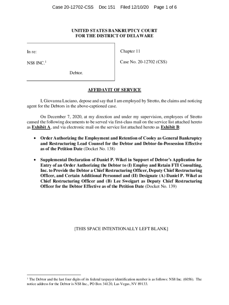 Case 2012702CSSDoc 151Filed 12/10/20Page 1 of 6UNITED STATES BANKRUPTCY COURT FOR THE DISTRICT OF DELAWARE In re:Chapter 11NS8 INC.1Case No. 2012702 (CSS) Debtor. AFFIDAVIT OF SERVICE I, Giovanna