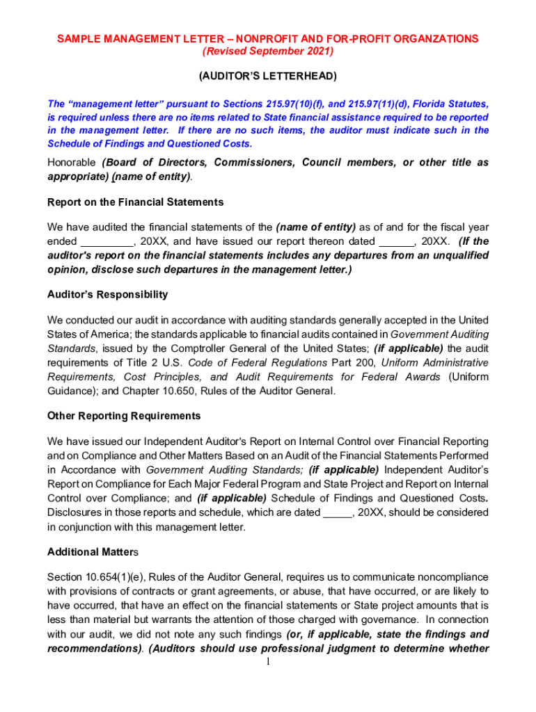 SAMPLE MANAGEMENT LETTER NONPROFIT AND FOR-PROFIT ORGANIZATIONS (Revised September 2021) (AUDITORS LETTERHEAD) The management letter pursuant to Sections 215.97(10)(f), and 215.97(11)(d), Florida