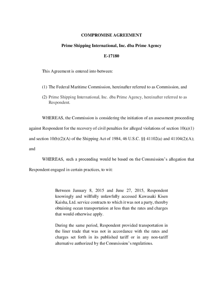 COMPROMISE AGREEMENT Prime Shipping International, Inc. DBA Prime Agency E17180This Agreement is entered into between:(1) The Federal Maritime Commission, hereinafter referred to as Commission, and