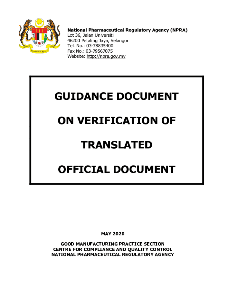 National Pharmaceutical Regulatory Agency (NPR) Lot 36, Japan University 46200 Pedaling Jay, Selangor Tel. No.: 0378835400 Fax No.: 0379567075 Website: http://npra.gov.myGUIDANCE DOCUMENT ON VERIFICATION