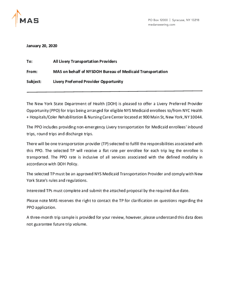 To:All Livery Transportation ProvidersFrom:MAS on behalf of NYS DOH Bureau of Medicaid TransportationSubject:Livery Preferred Provider Opportunity New York State Department of Health