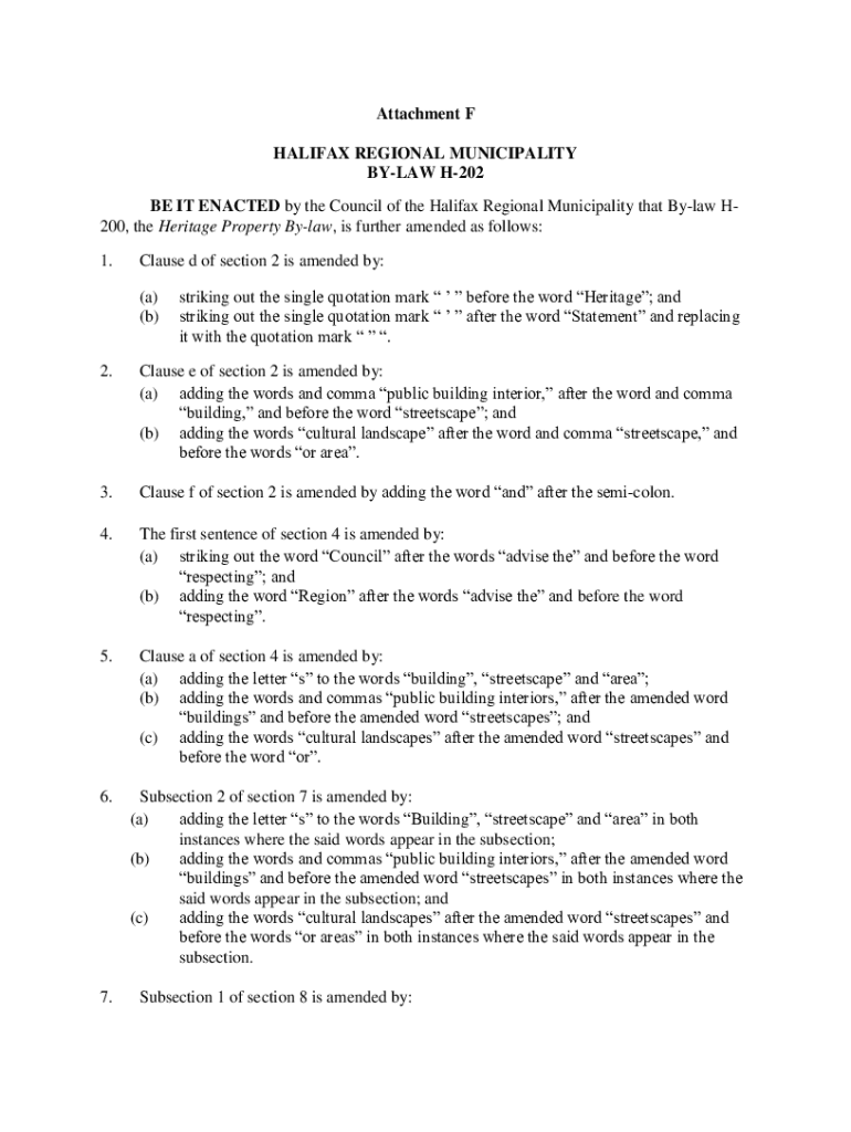 Attachment F HALIFAX REGIONAL MUNICIPALITY BYLAW H202 BE IT ENACTED by the Council of the Halifax Regional Municipality that Bylaw H200, the Heritage Property Bylaw, is further amended as follows: