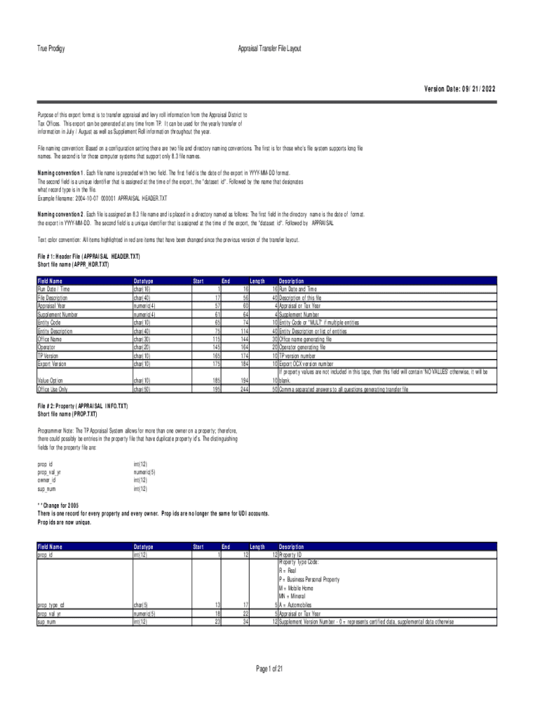 Get the free True Prodigy Appraisal Transfer File Layout Version Date