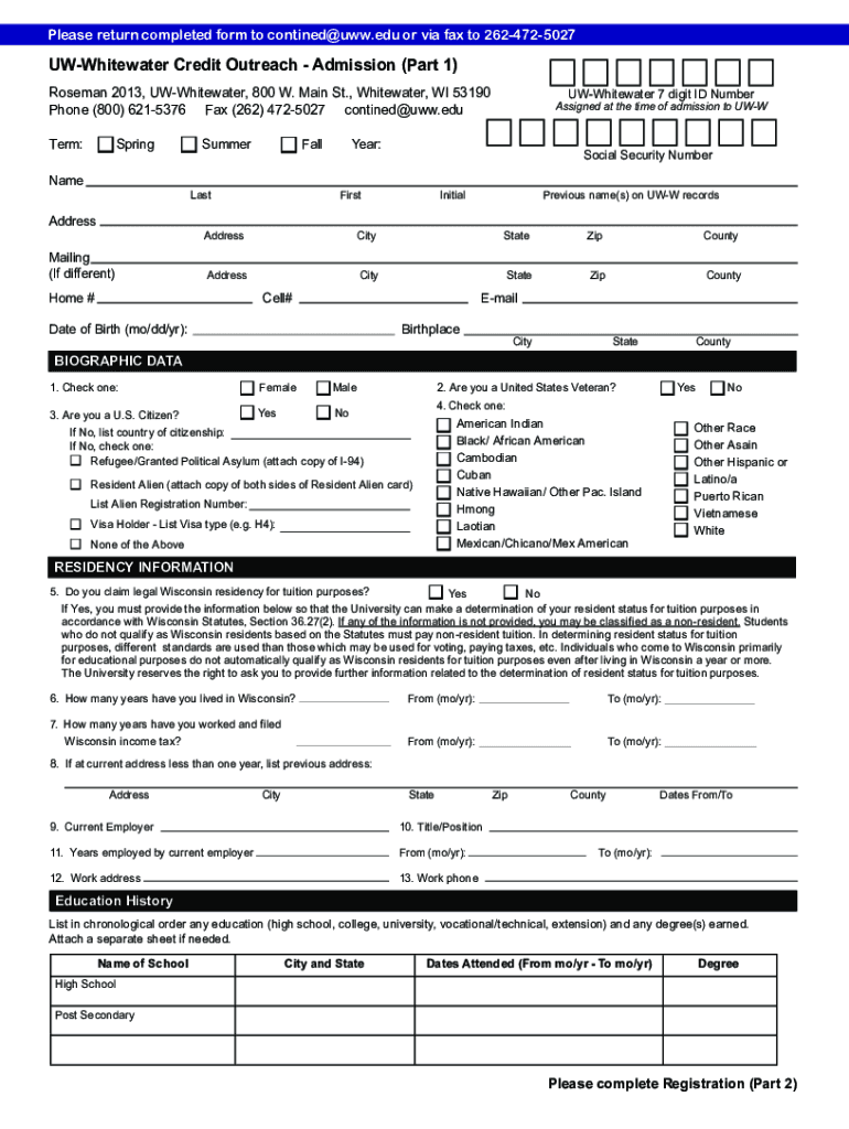 Please return completed form to contined@uww.edu or via fax to 2624725027UWWhitewater Credit Outreach Admission (Part 1)