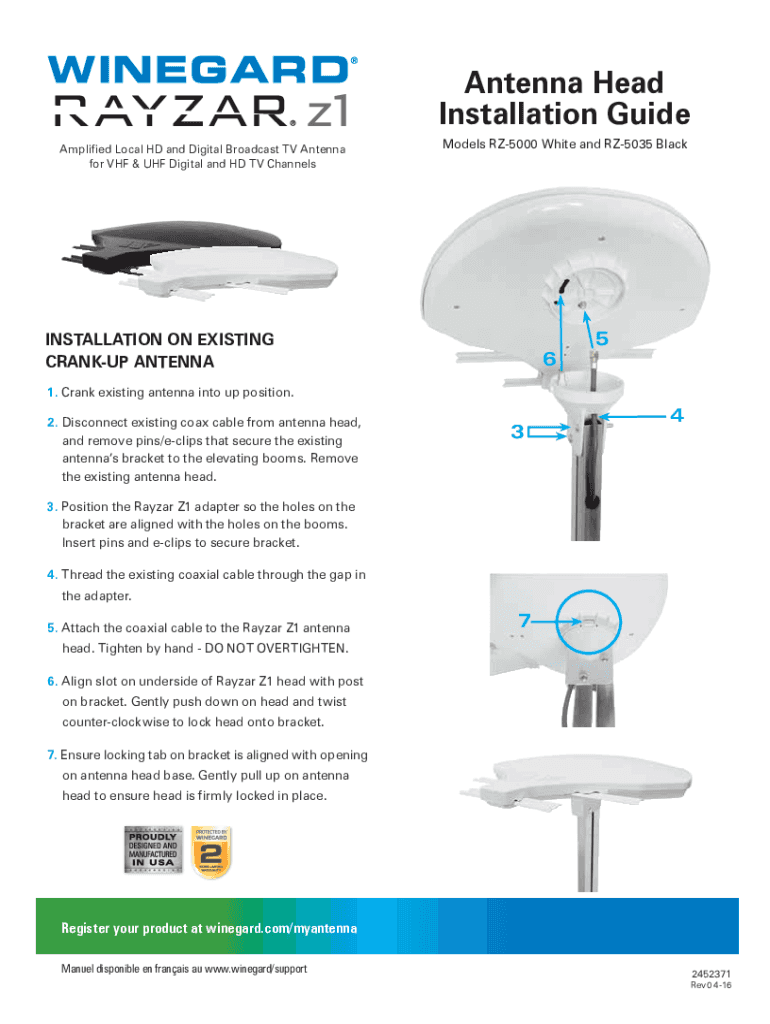 Antenna Head Installation Guide Amplified Local HD and Digital Broadcast TV Antenna for VHF & UHF Digital and HD TV ChannelsModels RZ5000 White and RZ5035 BlackINSTALLATION ON EXISTING CRACKUP ANTENNA651.