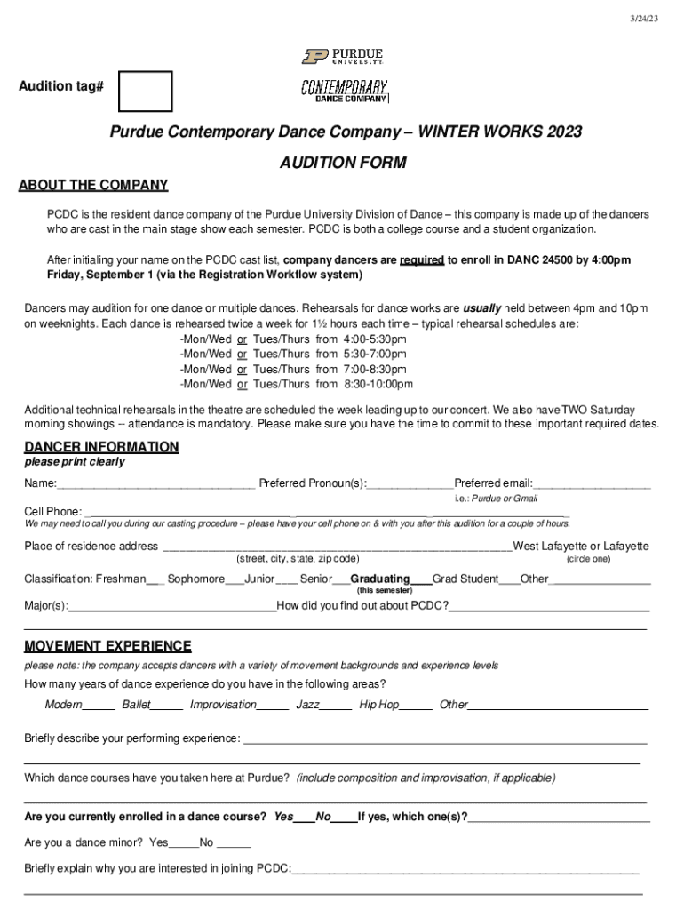 3/24/23Audition tag#Purdue Contemporary Dance Company WINTER WORKS 2023 AUDITION FORM ABOUT THE COMPANY CDC is the resident dance company of the Purdue University Division of Dance this company is