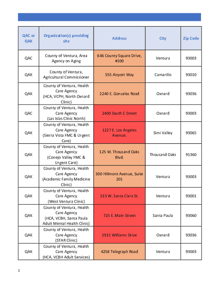 MAC or Organization(s) providing siteAddressCityZip CodeQACCounty of Ventura, Area Agency on Aging646 County Square Drive, #100Ventura93003QAKCounty of Ventura, Agricultural Commissioner555 Airport