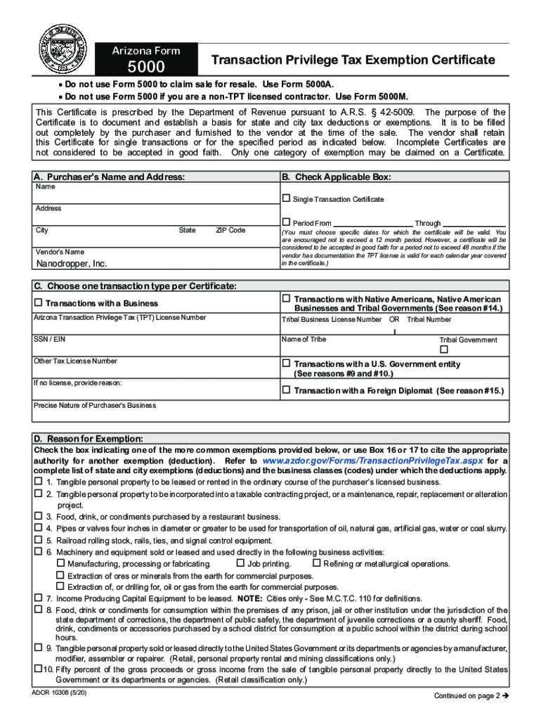 Arizona Form5000Transaction Privilege Tax Exemption Certificate Do not use Form 5000 to claim sale for resale. Use Form 5000A. Do not use Form 5000 if you are a nonTPT licensed contractor. Use Form