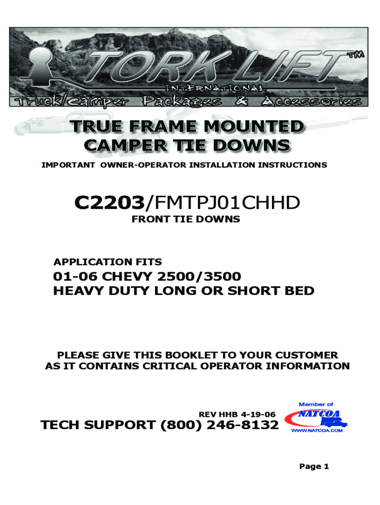 IMPORTANT OWNEROPERATOR INSTALLATION INSTRUCTIONSC2203/FMTPJ01CHHD FRONT TIE DOWNSAPPLICATION FITS0106 CHEVY 2500/3500 HEAVY-DUTY LONG OR SHORT RELEASE GIVE THIS BOOKLET TO YOUR CUSTOMER AS IT CONTAINS
