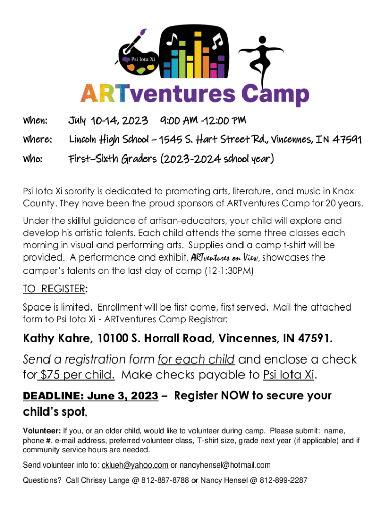 When:July 1014, 20239:00 AM 12:00 Where:Lincoln High School 1545 S. Hart Street Rd., Incenses, IN 47591Who:FirstSixth Graders (20232024 school year)Psi Iota Xi sorority is dedicated to promoting arts,