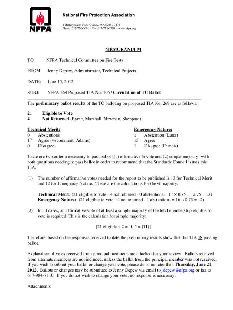 National Fire Protection Association 1 Battery march Park, Quincy, MA 021697471 Phone: 6177703000 Fax: 6177700700 www.nfpa.orgMEMORANDUM TO:NFPA Technical Committee on Fire TestsFROM:Jenny Deep, Administrator,